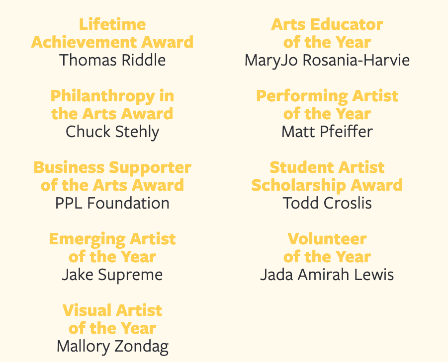 Named for Marlene “Linny” Fowler—an artist, philanthropist, and lifelong advocate for the arts—the awards honor individuals and organizations whose work carries forward her legacy of creativity, equity, and access. Linny’s vision touched nearly every corner of the region, from helping found the Banana Factory Arts Center to championing institutions such as ArtsQuest, the Allentown Art Museum, the Baum School of Art, Northampton Community College, the State Theatre, and Valley Youth House. This year’s honorees embody that same spirit, demonstrating the transformative power of the arts on stage, in classrooms, behind the scenes, and throughout the community.