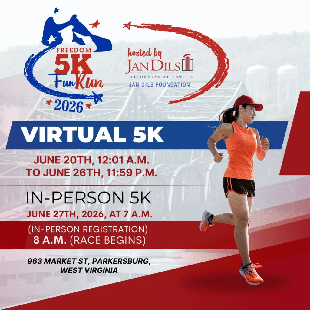 Jan Dils, Attorneys at Law, is thrilled to once again host the 2026 Freedom Fun Run 5K—with both in-person and virtual options! Be part of the action on June 27 in Parkersburg, WV, or participate virtually from June 20–26. Your participation fuels fun, fitness, and community, and 100% of proceeds benefit Veterans-related programs. All are welcome to join—run or walk, any pace! Enjoy refreshments, entertainment, and awards on race day as we celebrate our amazing participants. Visit our event webpage to learn more.