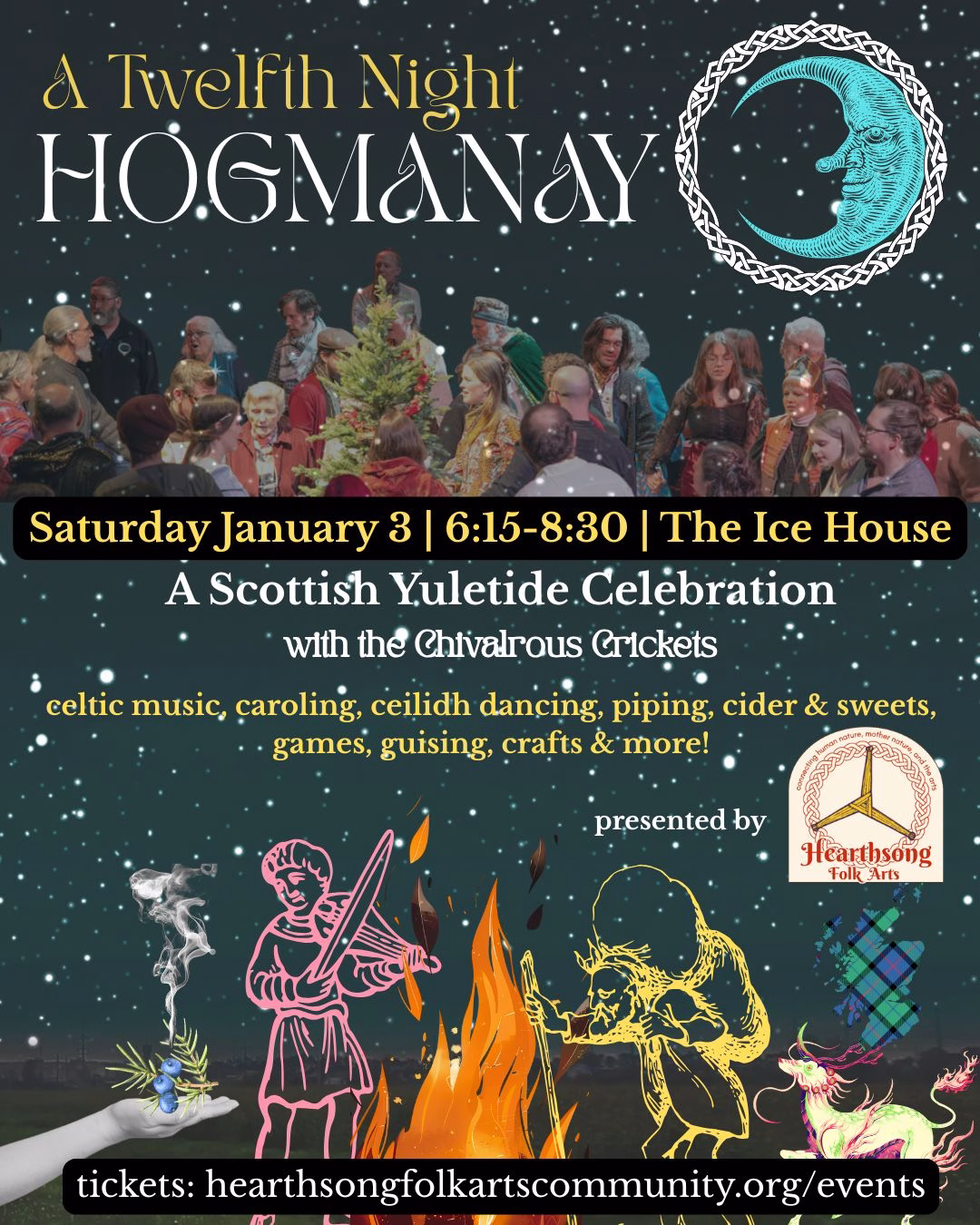 Celtic musical troupe The Chivalrous Crickets & Friends hosts an annual Christmas event unlike any other. Experience the folk magic, mayhem and mystery of an old world Twelfth Night Yuletide celebration – this year with a nod to the uniquely Scottish holiday of Hogmanay. Caroling, ceilidh dancing (watch or join!), tunes and songs, storytelling, sweets & cider, masking, decorations, mid-show trivia game hosted by Steven Bost, children’s games, Lord of Misrule lottery and folk customs of yore galore await at this unique event – part show, part festival, part large community party! Join a piping processional; have your New Year fortune read at the “Divination Station”; learn about the ancient custom of Saining; experience a centuries-old mummer’s play replete with sword fights and other nonsense, and beware of Trows – Scotland’s otherworldly Yuletide troublemakers. From the strange to the hearth-warming, discover the fascinating and deep history of Christmas through this experiential, family-friendly extravaganza. Lobby activities begin at 6:15 Tickets range from $10-$25