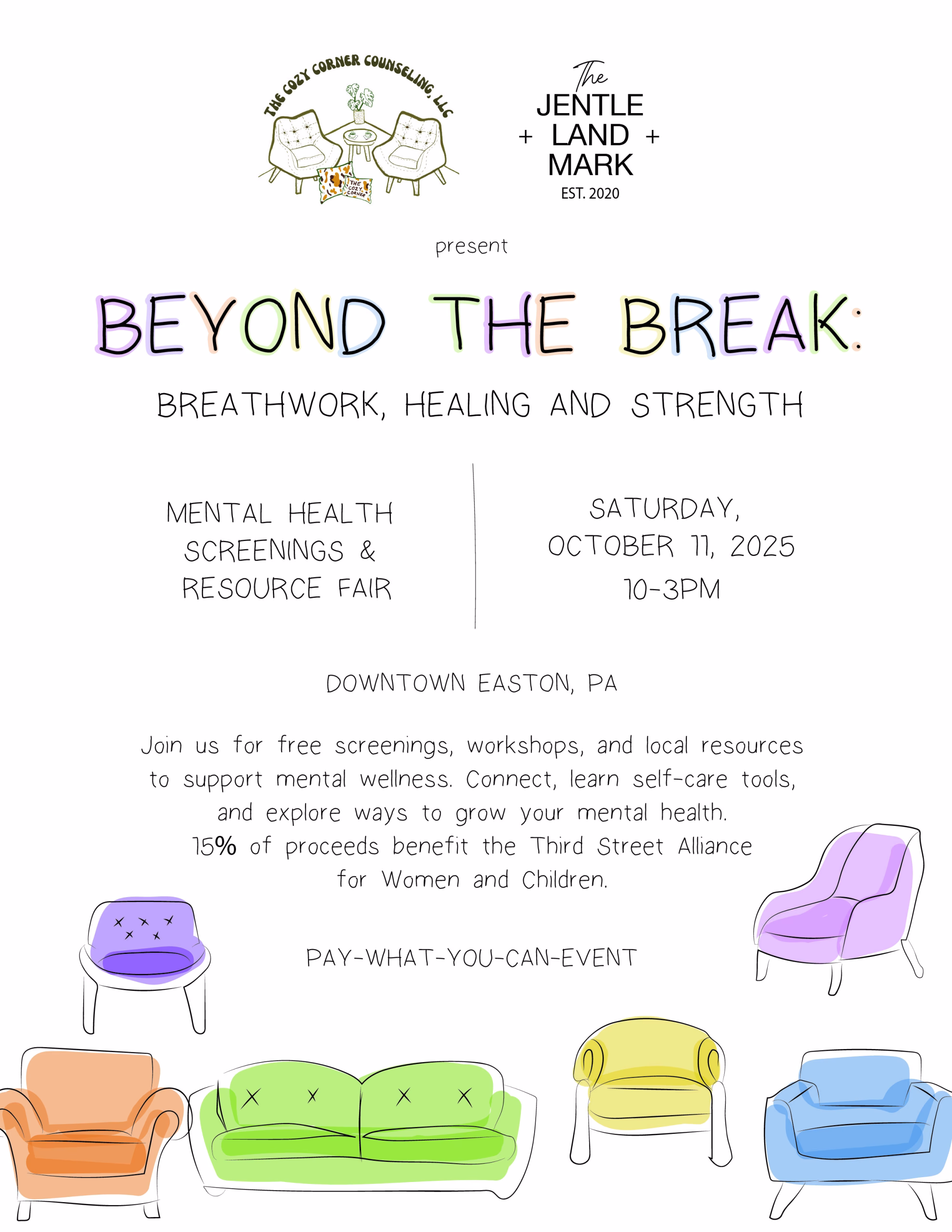Beyond the Break: Breathwork, Healing and Strength Mental Health Screenings and Resource Fair Saturday, October 11, 2025 10am-3pm Join us for Beyond the Break, a community-focused event dedicated to prioritizing mental health in a welcoming and supportive environment. The event offers free mental health screenings, access to local providers, and a variety of interactive workshops covering topics like therapy basics, mindfulness, trauma support, creative expression, and stress relief. Our goal is to reduce stigma, encourage early support, and provide tools for everyday mental wellness. Through hands-on activities, reflective practices, and engaging conversations, participants can connect, learn, and grow alongside neighbors, families, and local organizations. Beyond the Break highlights the power of community, making mental health care approachable, collaborative, and rooted in connection. All mental health screenings, resources, and workshops are pay-what-you-can. Donations are strongly encouraged. 15% of proceeds will be donated to the Third Street Alliance for Women and Children.