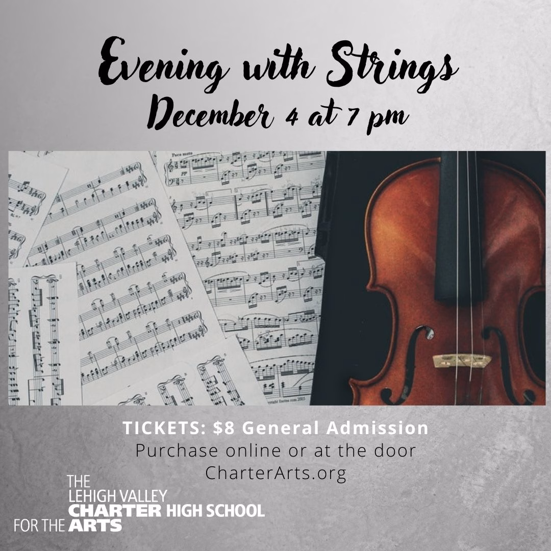 Join the Lehigh Valley Charter High School for the Arts (Charter Arts) Music Department for an “Evening with Strings’ on Thursday, December 4, 2025 at 7 PM! This delightful evening of string performances from the studio of Mrs. Rachel Hart will include Mozart’s virtuosic Violin Concerto in D Major, cello works by African-American composer Florence Price, and the department’s 9th and 10th grade string ensemble performing Corelli’s “Christmas” Concerto, accompanied by Mr. David Macbeth on harpsichord! Tickets are $8 General Admission at CharterArts.org or at the door. ABOUT THE CHARTER ARTS MUSIC CURRICULUM: The Charter Arts Instrumental Music Department offers a rigorous music education taught by award-winning and accomplished faculty. The instrumental music curriculum includes classes in classical, jazz, and contemporary music styles while performing in large ensembles that include Orchestra, Jazz Ensemble, Wind Ensemble, Latin Music Ensemble and Contemporary Music Ensemble as well as small ensembles that include strings, guitar and percussion. Students enjoy individual and small setting technique classes with a music faculty member who specializes in their instrument. These specialists include bass (electric and upright), brass, guitar, percussion, piano, strings, and woodwinds. ABOUT THE LEHIGH VALLEY CHARTER HIGH SCHOOL FOR THE ARTS: Charter Arts is an audition-based public charter school, funded by Pennsylvania taxpayer dollars, that provides a comprehensive curriculum for high school students, grades 9-12, who have a dedicated passion for the creative or performing arts. Students major in one of seven artistic areas: Dance, Instrumental Music, Literary Arts, Production Arts, Theatre, Visual Arts, or Vocal Music. Charter Arts’ rigorous curriculum fosters both academic and artistic excellence for its students. The school’s impressive Advanced Placement (AP) exam statistics, Keystone Exam statistics, SAT scores, prestigious artistic accolades, and graduation rate, are testaments to the outstanding education that Charter Arts provides. An award-winning, nationally recognized institution, Charter Arts is currently ranked: — #1 Best Charter High School in PA (Niche) — #1 Best Public High School Teachers in PA (Niche) — Top 10 Charter Schools in PA (U.S. News & World Report) Prospective students and families who are interested in learning more about the music program and the school are encouraged to attend an upcoming Admissions Open House event on December 6th. Visit CharterArts.org for more information and to RSVP.