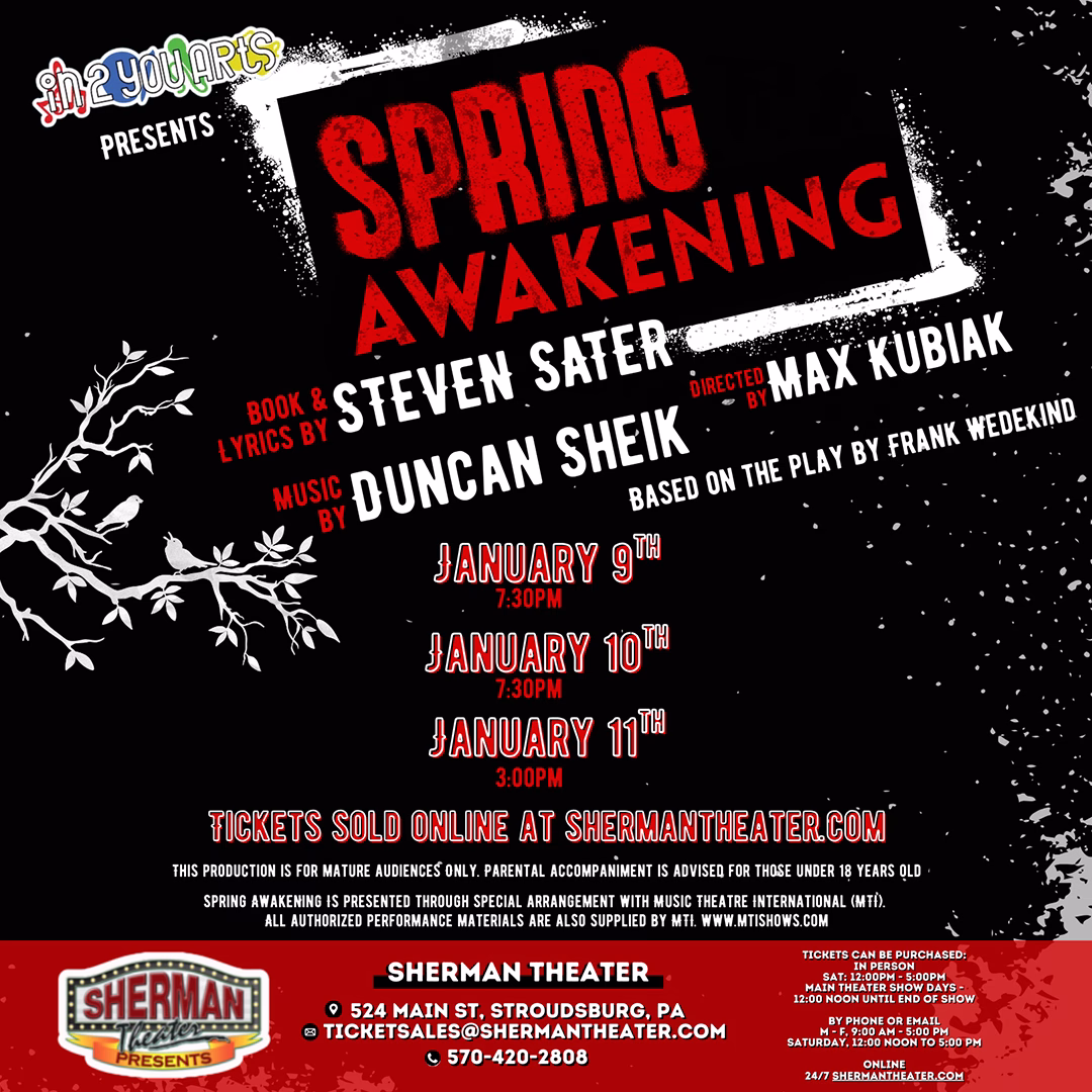Friday, January 09 Saturday, January 10 Doors: 6:30 pm // Show: 7:30 pm Sunday, January 11 Doors: 2 pm // Show: 3 pm $20 to $34.90 (fees included) *This production is for mature audiences only. Parental accompaniment is advised for those under 18 years old. In2YouArts proudly presents Spring Awakening, an electrifying, Tony Award-winning rock musical that explores the journey from adolescence to adulthood with raw emotion and unforgettable music. Set in 1891 Germany, this groundbreaking show fuses morality, sexuality, and rock & roll in a moving story of discovery and rebellion. Featuring a powerful pop-rock score by Duncan Sheik and Steven Sater, Spring Awakening is an angsty rock musical adaptation of the seminal play about the trials and tribulations of growing up.