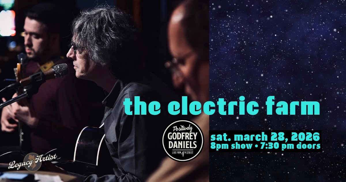 The Electric Farm returns with their singular blend of soft pop, folky textures, and space-rock imagination—an approach shaped by the atmospheric beauty of Nick Drake, the emotional weight of Neil Young, and the off-beat storytelling spirit of The Kinks. Led by songwriter Joey Mutis, whose music has appeared across major television and film, the band has spent more than 30 years shaping its melodic identity on East Coast stages, from Godfrey Daniels to iconic rooms like CBGB and 40 Watt Club. With four studio albums and a history that includes collaborations with Peter Buck of R.E.M. and openings for artists as varied as The SunRa Arkestra, Strawbs, and Railroad Earth, The Electric Farm brings a night of musical adventure perfect for the intimate, welcoming setting of Godfrey Daniels.