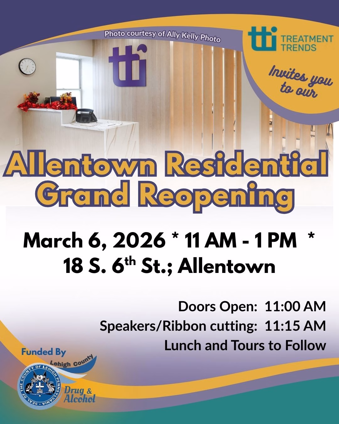 Join community leaders, healthcare professionals, and local partners as we celebrate the grand reopening of Treatment Trends Allentown Residential, a newly revitalized residential treatment facility dedicated to supporting individuals on their journey to recovery. Located in the heart of Allentown, this state-licensed and regulated 50-bed, co-ed 3.5 level residential drug and alcohol treatment facility provides a supportive and professionally managed environment where individuals can focus on healing, personal growth, and long-term recovery. Treatment Trends Allentown Residential takes an individualized, person-centered approach to care. Every resident’s story and experience are valued, and treatment plans are designed to meet the unique needs of each individual. The program focuses on helping residents reconnect with themselves, their families, and their communities while restoring dignity, purpose, and hope for the future. The facility offers a comprehensive range of recovery services and pathways, including: • Evidence-based therapies • 12-Step program integration • Clinical interventions • Peer support and community-building Medication-Assisted Treatment (MAT) options are also available to support recovery when appropriate. These include oral naltrexone, extended-release naltrexone (Vivitrol), extended-release buprenorphine (Sublocade), and buprenorphine-naloxone medications such as Suboxone and Zubsolv. Allentown Residential is a non-smoking facility, with designated smoke breaks scheduled for residents throughout the day. This grand reopening event will feature a formal ribbon cutting ceremony, remarks from community leaders and partners, and an opportunity to learn more about the facility’s programs and its role in supporting recovery throughout the Lehigh Valley. The event is hosted by Lehigh County Drug & Alcohol, Treatment Trends Inc., and the Center for Humanistic Change, organizations committed to strengthening recovery resources and improving the lives of individuals and families affected by substance use. Community members, partners, and local stakeholders are welcome to attend.